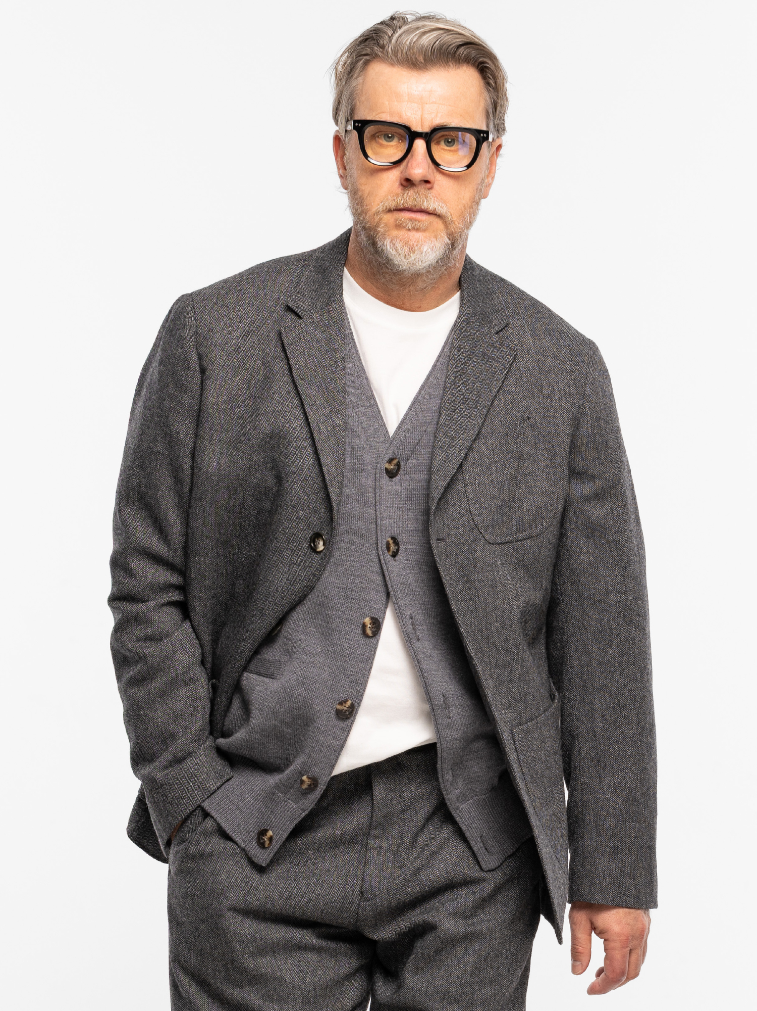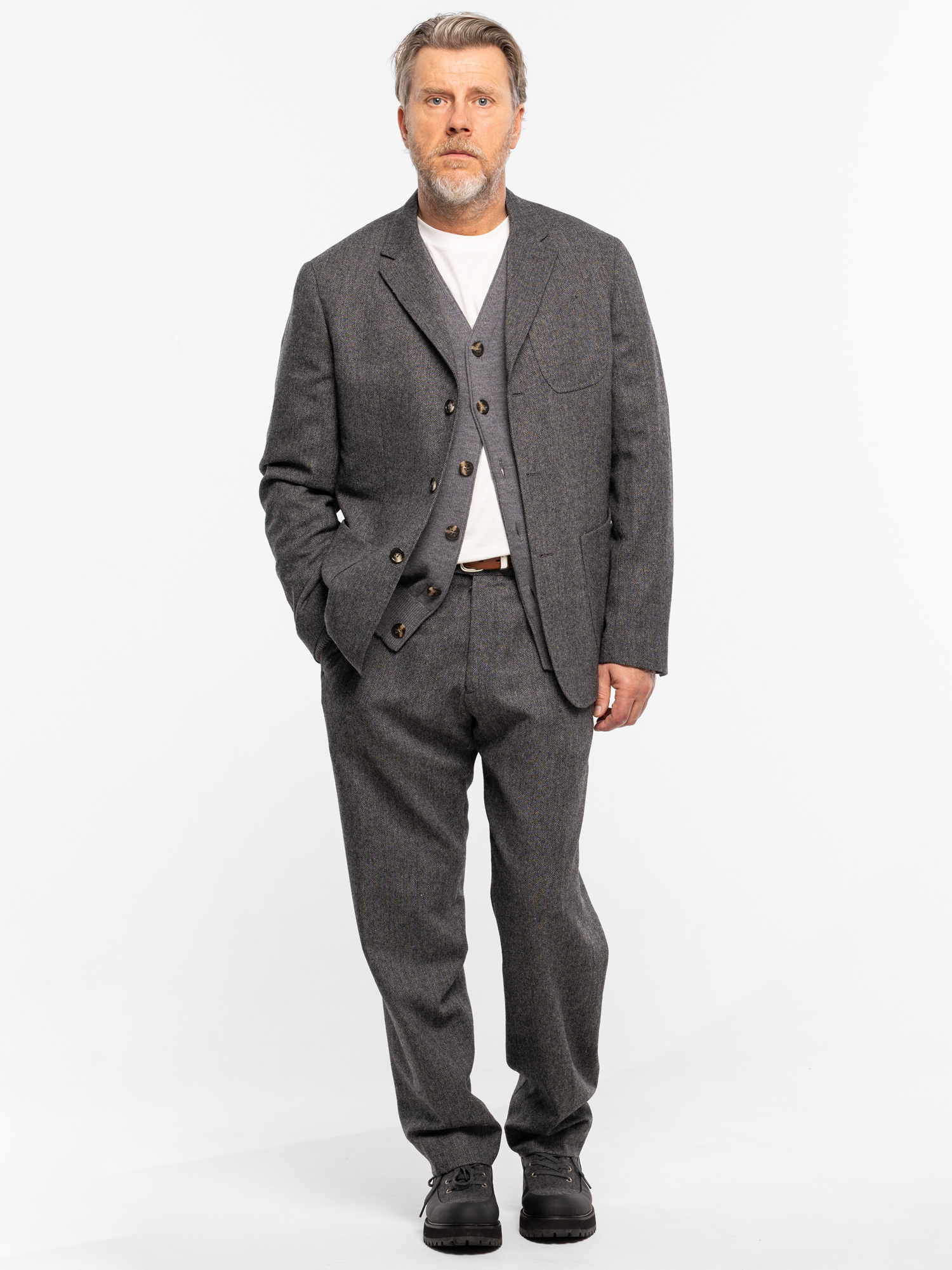 Пиджак изготовлен из смесовой ткани: 50% шерсть, 50% полиэстер. Свободный силуэт, мягкая линия плеча, облегчённая подкладка обеспечивают комфорт в эксплуатации и создают неформальный образ: